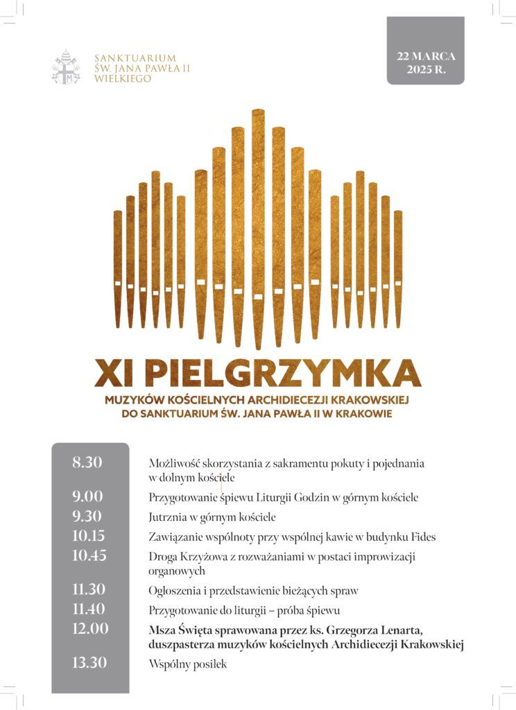 Dnia 22 marca odbyła się XI Pielgrzymka Muzyków Kościelnych Archidiecezji Krakowskiej do Sanktuarium św. Jana Pawła II w Krakowie, która była połączona z Dniem Skupienia Organistów. W wydarzeniu wzięło udział około 160 osób. Na początku była możliwość przystąpienia do sakramentu Pokuty i Pojednania, następnie muzycy odśpiewali Jutrznię. Po tej porannej modlitwie wszyscy udali się na przerwę kawową. Następnym punktem programu była Droga Krzyżowa, którą prowadził ks. Grzegorz Lenart. Jej rozważania miały inny niż zwykle charakter, ponieważ tekst zastąpiły improwizacje organowe inspirowane poszczególnymi stacjami w wykonaniu znakomitych organistów: Krzysztofa Pawlisza, Marka Pawełka, Tomasza Soczka, Mateusza Peciaka, Dawida Rzepki, Tomasza Ślusarczyka, Łukasza Walczyka. Punktem centralnym była wspólna Eucharystia. Po niej wszyscy udali się na wspólny posiłek.